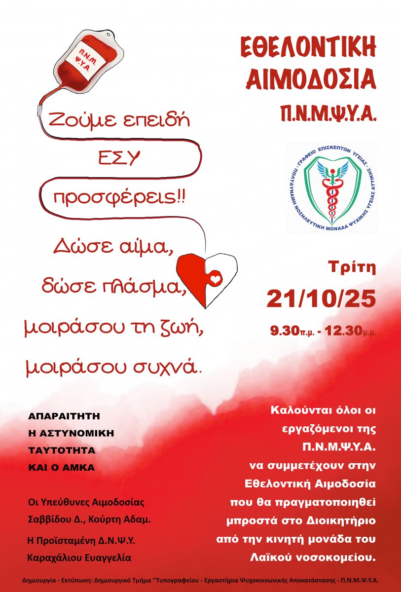 Σας ενημερώνουμε ότι την Τρίτη 21 Οκτωβρίου 2025 θα πραγματοποιηθεί Εθελοντική Αιμοδοσία στο Π.Ε.Δ.Υ.Ψ.Υ., από 9.30 π.μ. έως 12.30 μ.μ.